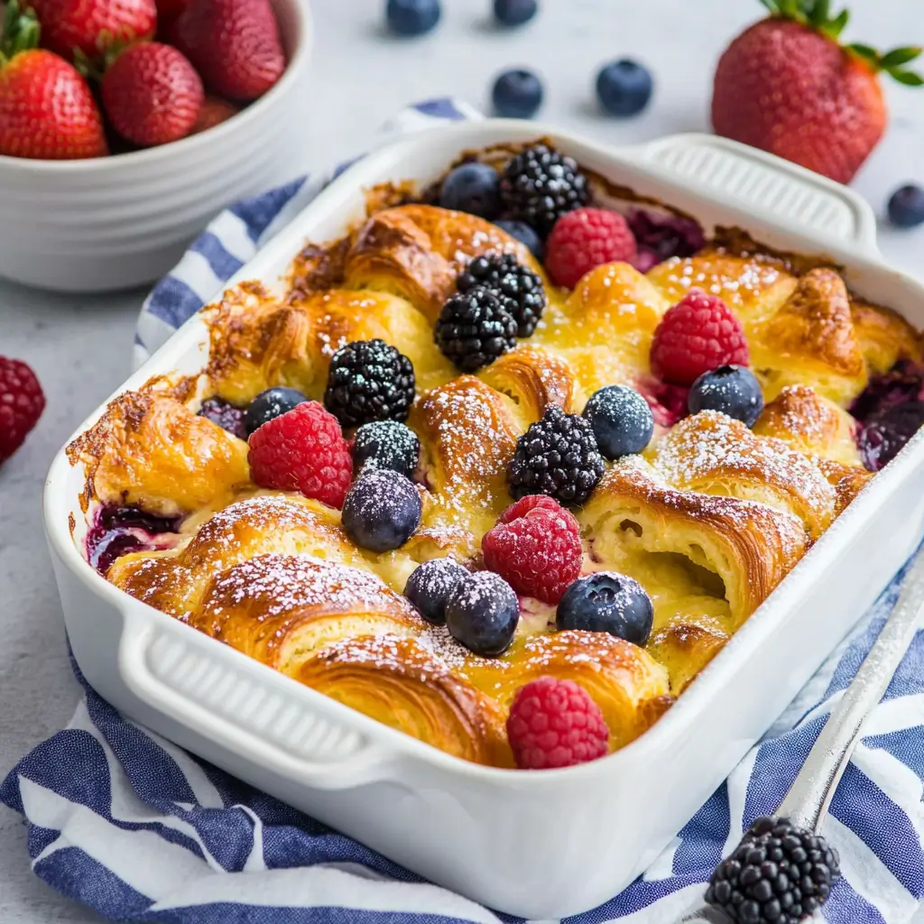 A decadent, easy-to-make brunch dish featuring buttery croissants, fresh berries, and a creamy custard. Perfect for holidays, weekends, or dessert.