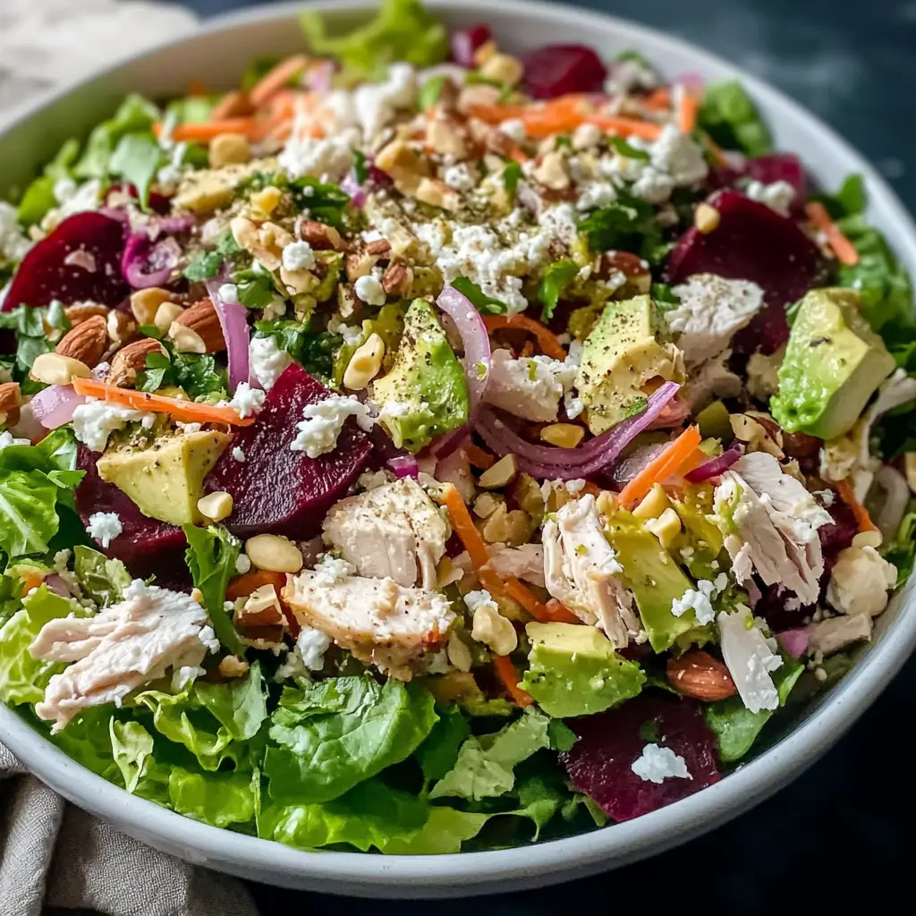 A vibrant and hearty salad that combines shredded chicken, roasted beets, avocado, goat cheese, crunchy pecans, and a tangy balsamic dressing for a complete and satisfying meal.