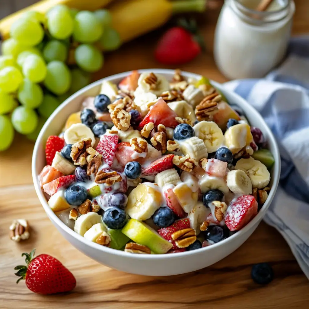 A fresh, colorful fruit salad tossed in a creamy Greek yogurt and honey dressing, topped with crunchy pecans. Perfect for breakfast or brunch.