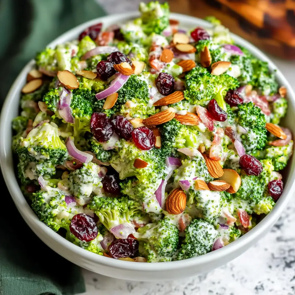 A fresh and crunchy salad made with broccoli, crispy turkey bacon, sweet dried cranberries, toasted almonds, and a tangy creamy dressing. Perfect for summer meals, picnics, or as a side to your favorite dish.