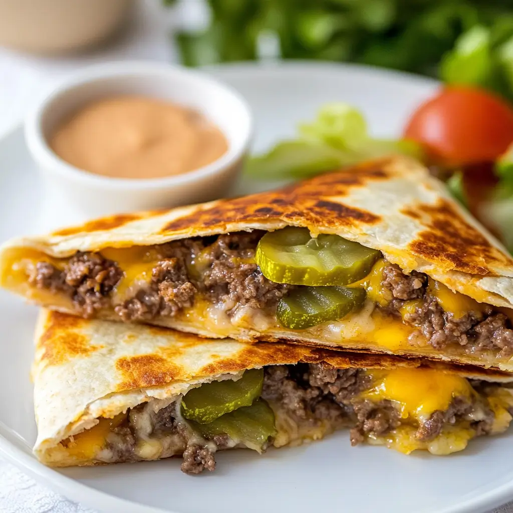 A crispy, cheesy, and flavor-packed cheeseburger quesadilla made with seasoned beef, melted cheddar, pickles, and onions, all folded into a golden tortilla. Served with a homemade burger sauce for the perfect dip. Quick, easy, and customizable, this recipe is a must-try for busy weeknights or weekend cravings.