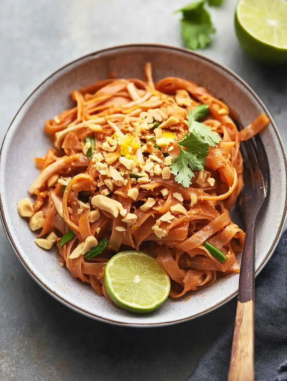10. Garnish and Serve: Remove from heat and plate your Chicken Pad Thai. Garnish with crushed peanuts and optional cilantro. Serve with lime wedges on the side.