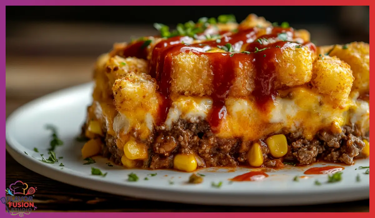 A hearty and comforting casserole featuring seasoned ground beef, crispy tater tots, melted cheddar cheese, and a creamy, flavorful sauce.