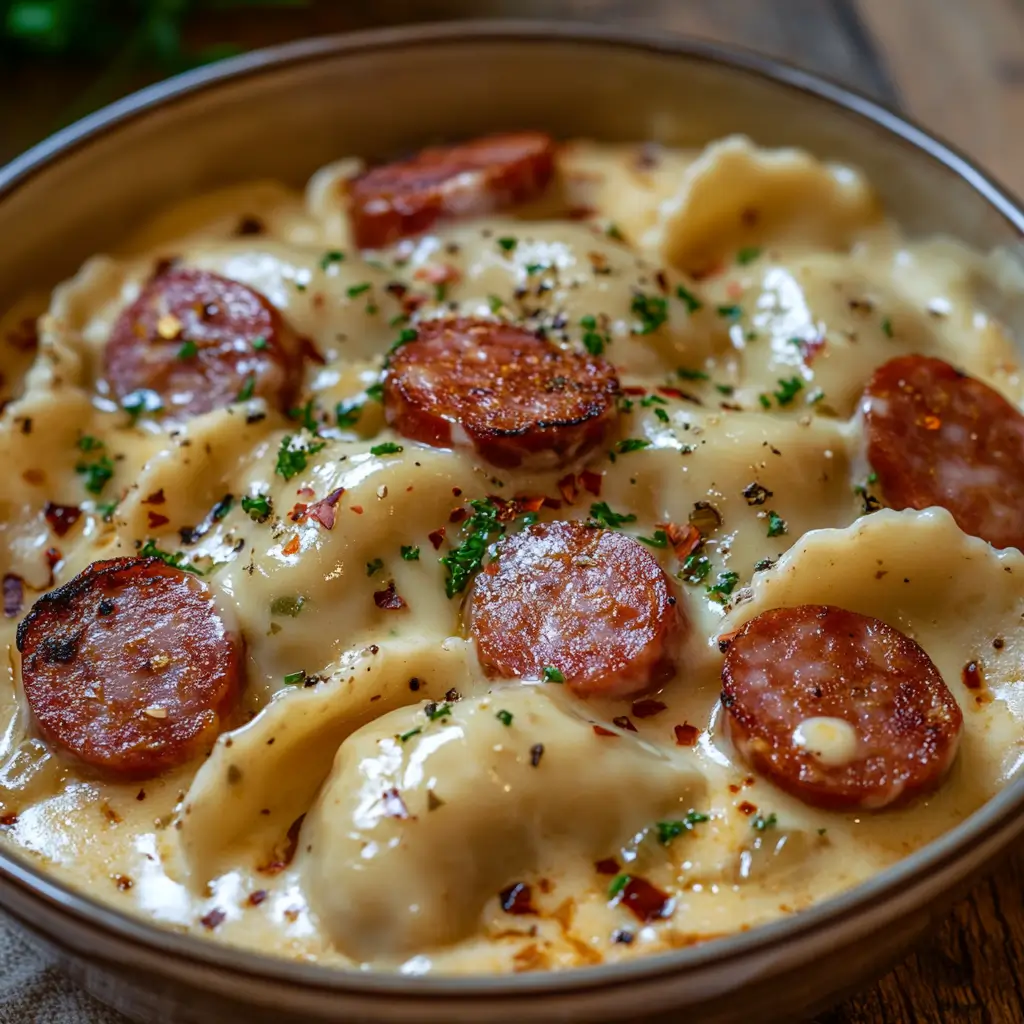 A rich, creamy, and cheesy slow cooker casserole made with tender pierogies, smoky kielbasa, and a flavorful cream cheese sauce. A perfect comfort meal with minimal effort!