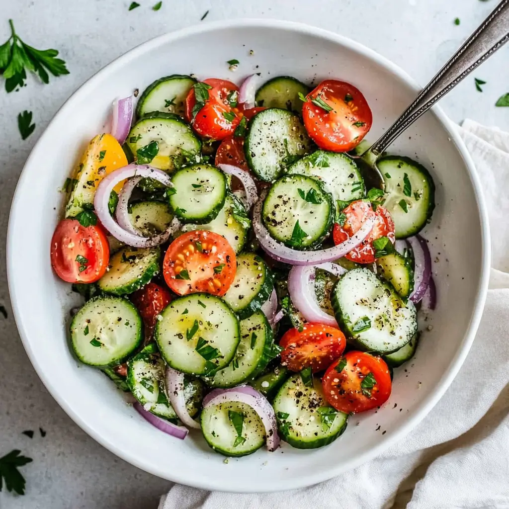 This vibrant cucumber tomato salad is a fresh and flavorful side dish made with crisp cucumbers, sweet cherry tomatoes, and a tangy red wine vinaigrette. Ready in just 10 minutes, it’s the perfect light salad for summer meals, BBQs, and quick lunches.