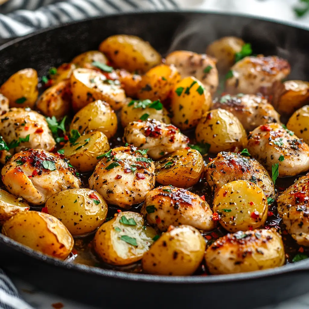 2. Spicy Cajun Chicken and Potatoes – Coat the chicken with Cajun seasoning for a bold, smoky heat. You can also add sliced bell peppers to the skillet for extra color and flavor.