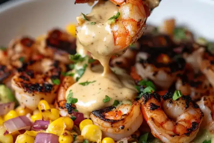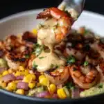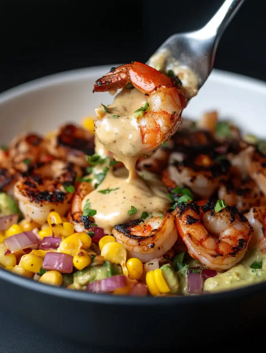 5. Assemble Bowls: In serving bowls, start with a base of grilled shrimp. Top with the corn salsa and drizzle the creamy sauce generously over the top.