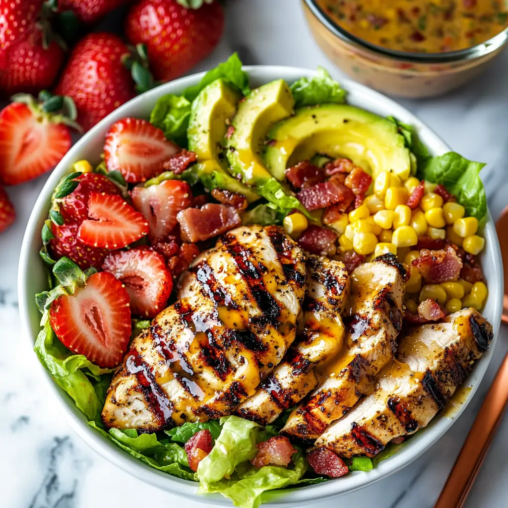 - Assemble the Salad – In a large bowl, combine romaine lettuce, strawberries, avocado, corn, and crispy bacon. Top with sliced grilled chicken.