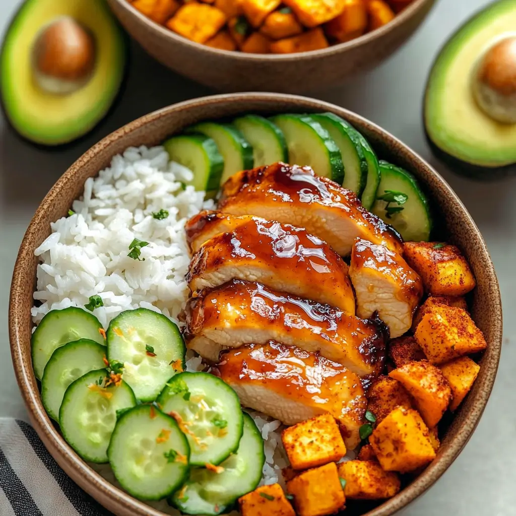 - Assemble bowls with rice or quinoa, chicken, veggies, carrots, and avocado.
