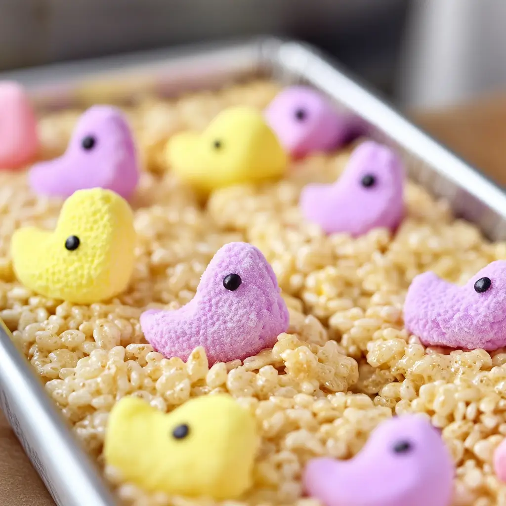 A fun and colorful twist on classic Rice Krispies Treats, made with Peeps marshmallows for a festive, gooey, and delicious Easter dessert.