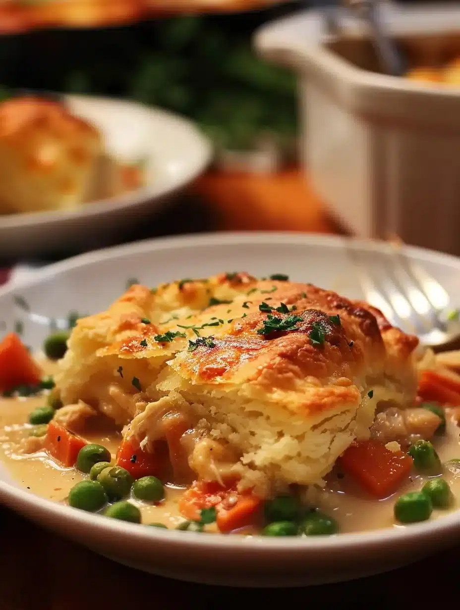 Imagine sitting down to a warm bowl of this pot pie, where the aroma of baked biscuits mingles with the savory scent of chicken and vegetables. Each bite offers a delightful crunch from the biscuit topping, contrasted by the creamy filling underneath. This recipe is perfect for family gatherings, cozy dinners at home, or anytime you crave something delicious and comforting.