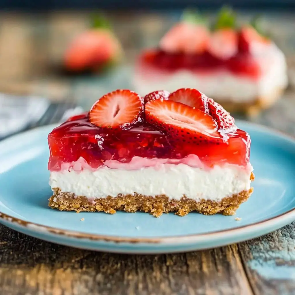 A classic layered dessert with a buttery pretzel crust, creamy sweet filling, and fresh strawberry Jell-O topping. Perfect for parties and gatherings!