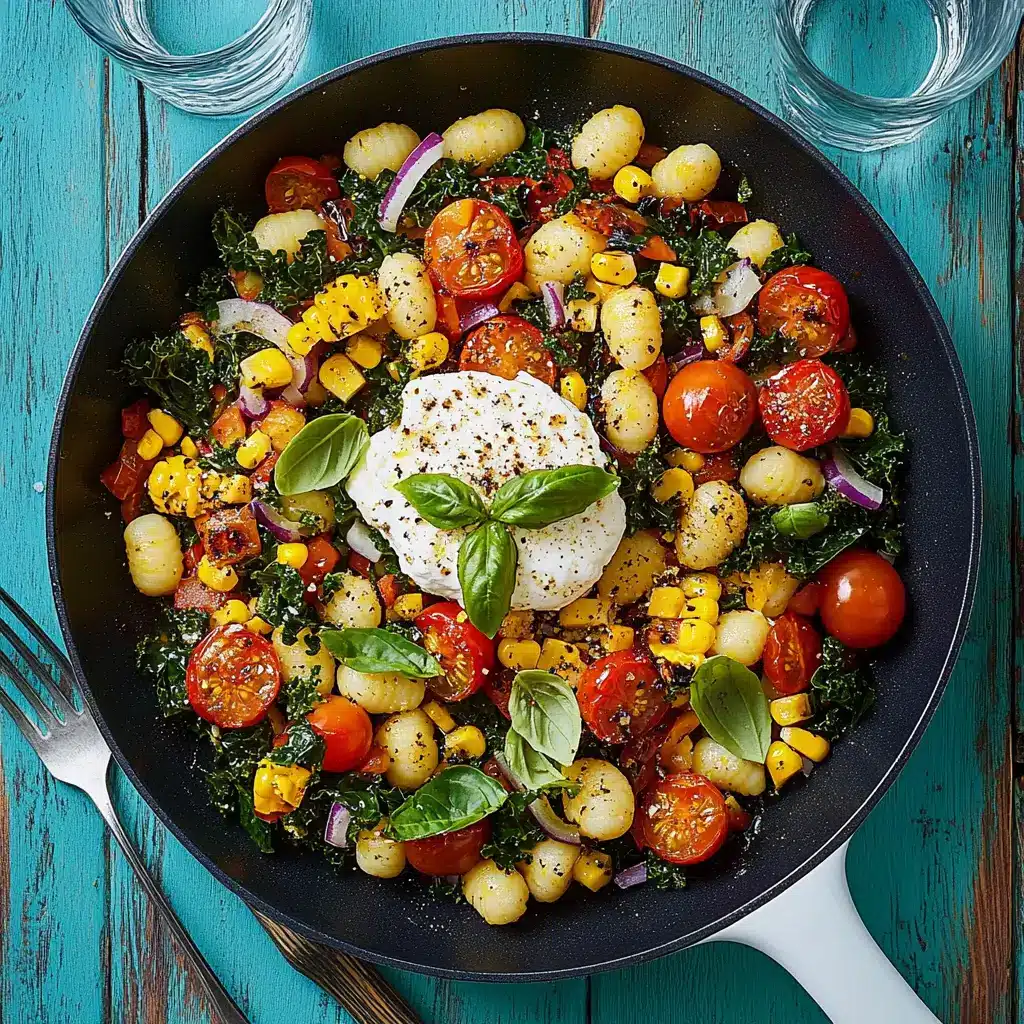 A vibrant one-skillet summer recipe featuring fluffy gnocchi, charred corn, blistered tomatoes, arugula, and creamy burrata for a fast and flavorful meal.